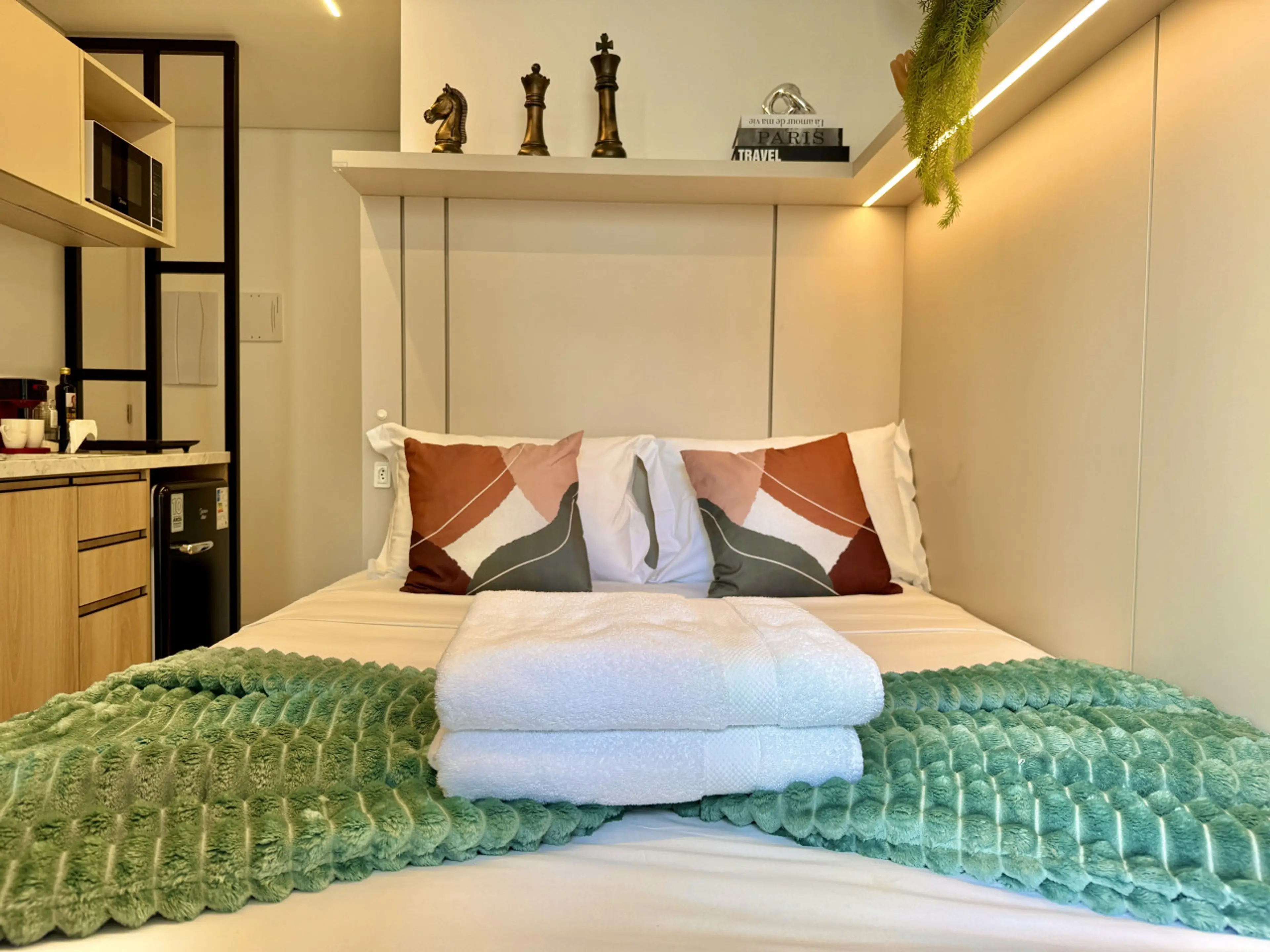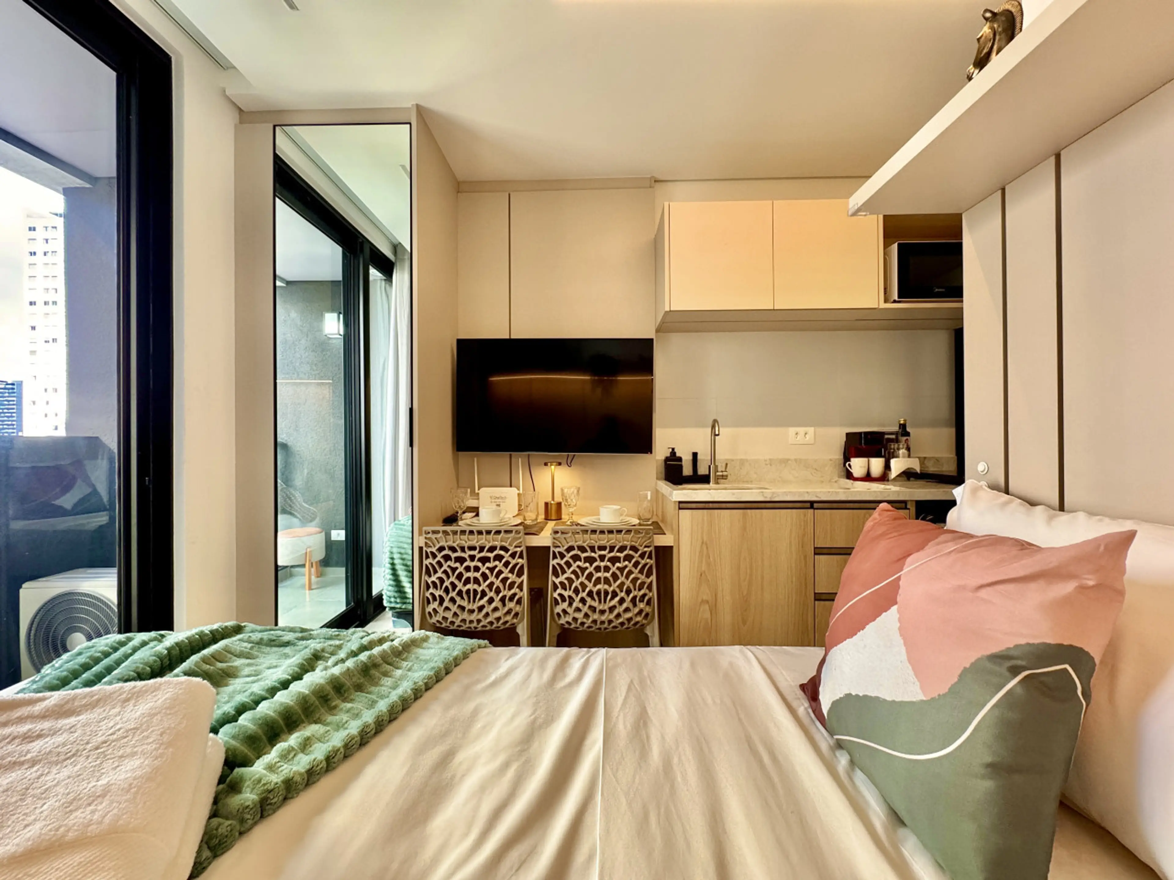 Studio Premium e aconchegante, totalmente pensado para Airbnb, no luxuoso Diamond Tower, no Batel. Cozinha compacta equipada com Geladeira, Fogão, Microondas, TV Smart", Cama Box Premium padrão Hotel, Ar condicionado e wifi, além de utensílios como panelas, copos, talheres, cafeteira, dentre outros....
