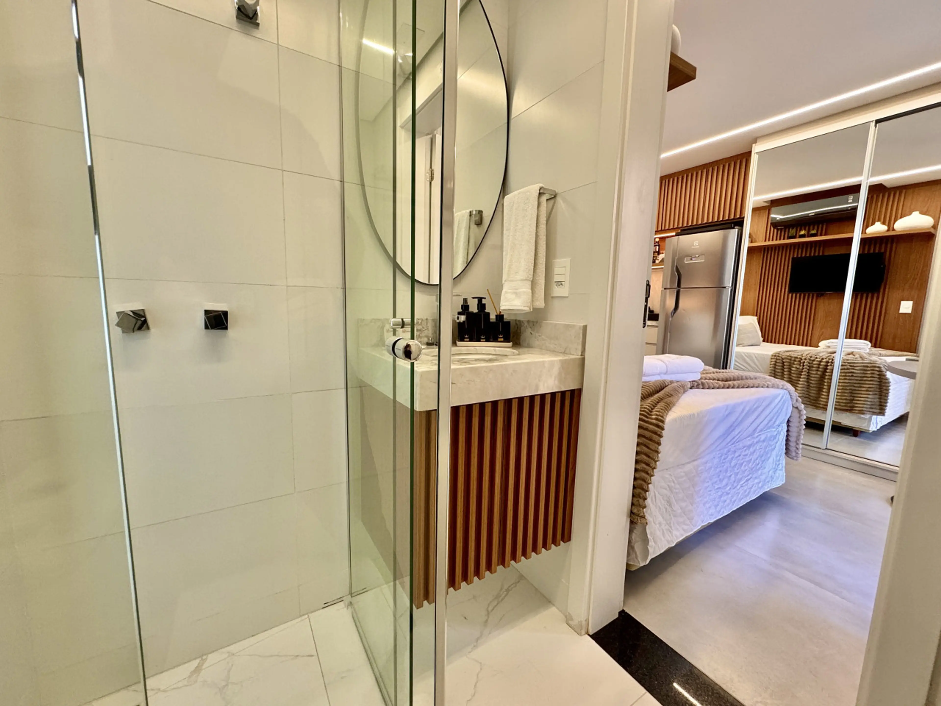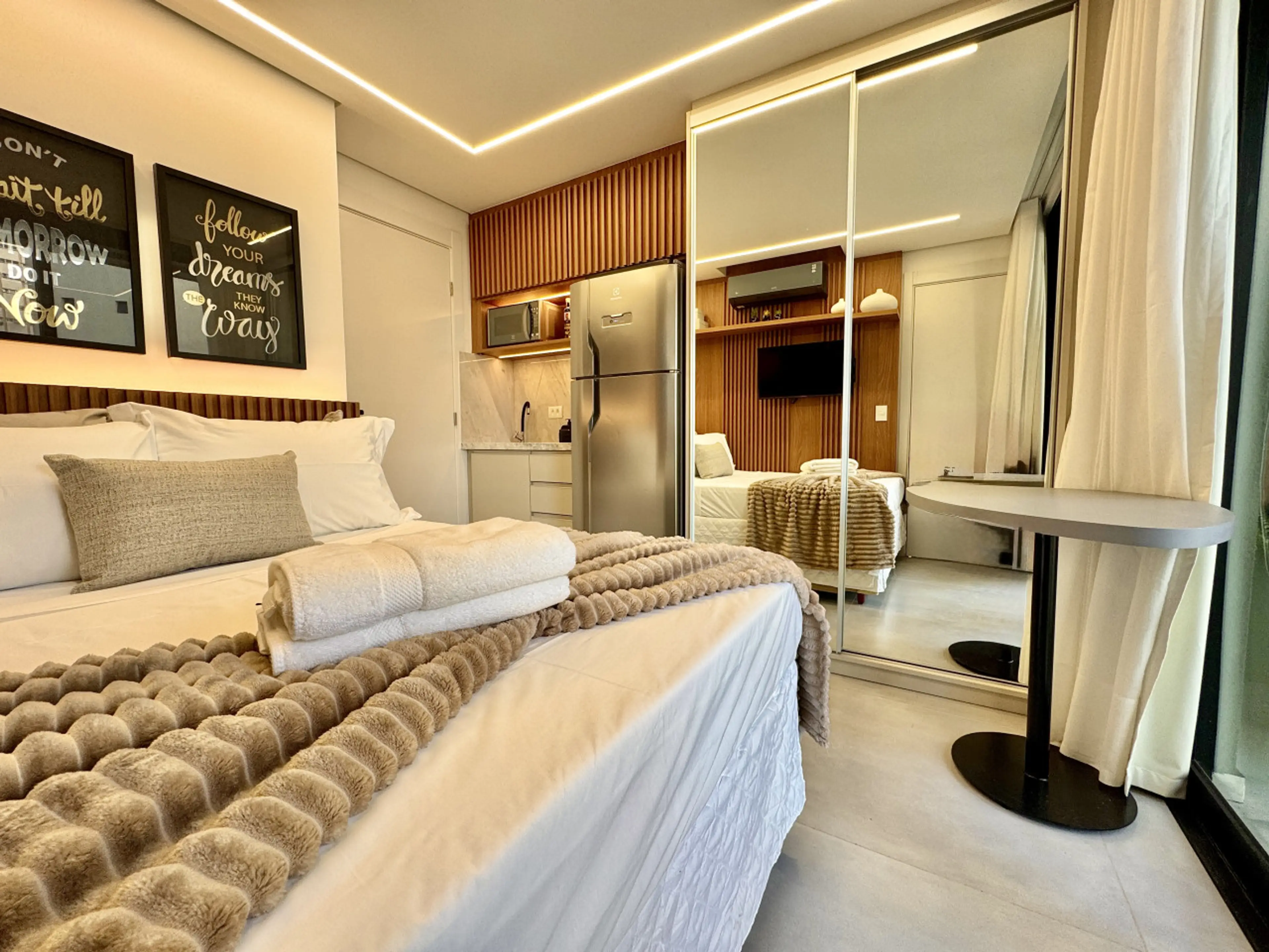 Studio Premium e aconchegante, totalmente pensado para Airbnb, no luxuoso Diamond Tower, no Batel. Cozinha compacta equipada com Geladeira, Fogão, Microondas, TV Smart", Cama Box Premium padrão Hotel, Ar condicionado e wifi, além de utensílios como panelas, copos, talheres, cafeteira, dentre outros....
