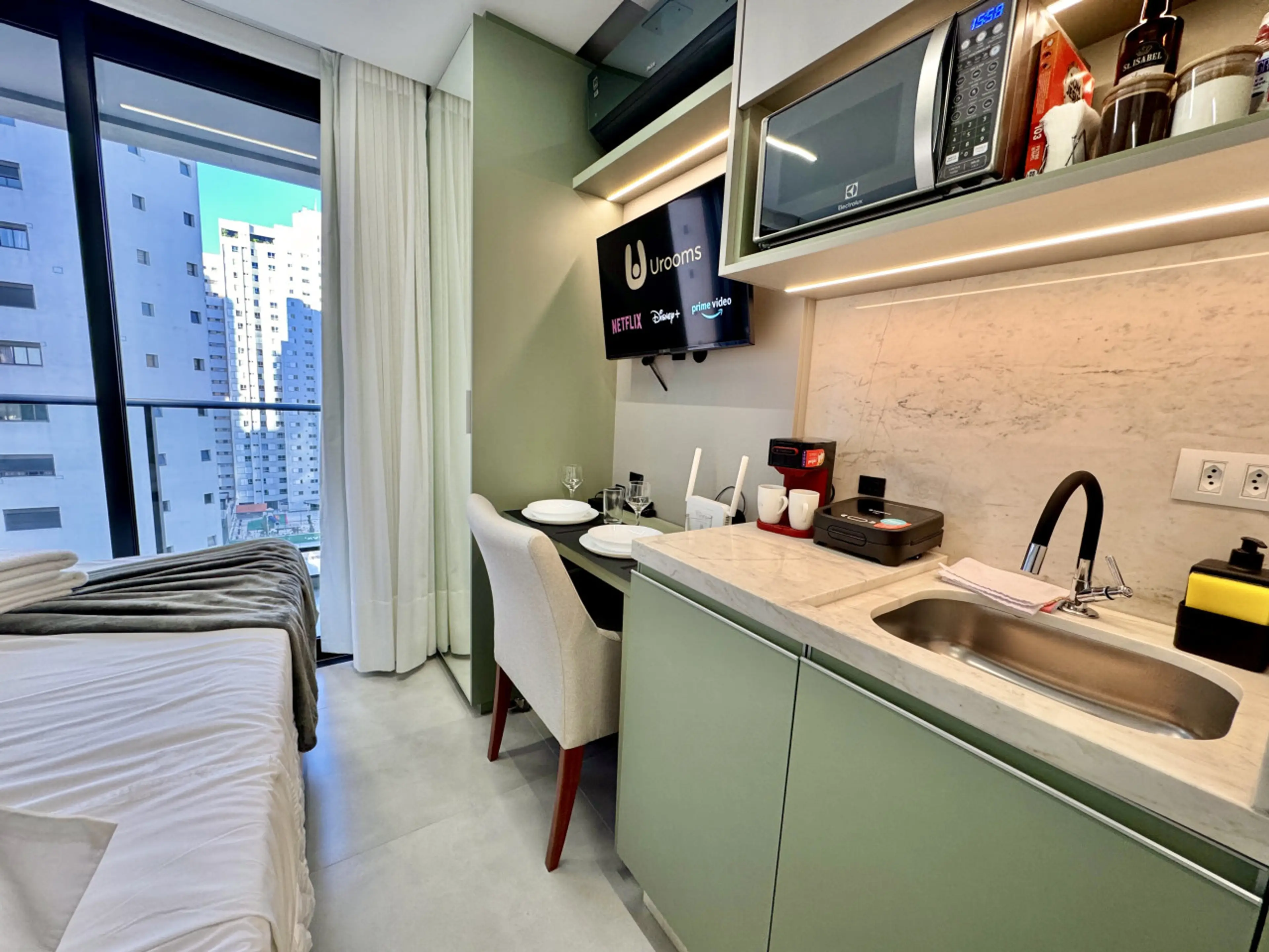 Studio Premium e aconchegante, totalmente pensado para Airbnb, no luxuoso Diamond Tower, no Batel. Cozinha compacta equipada com Geladeira, Fogão, Microondas, TV Smart", Cama Box Premium padrão Hotel, Ar condicionado e wifi, além de utensílios como panelas, copos, talheres, cafeteira, dentre outros....