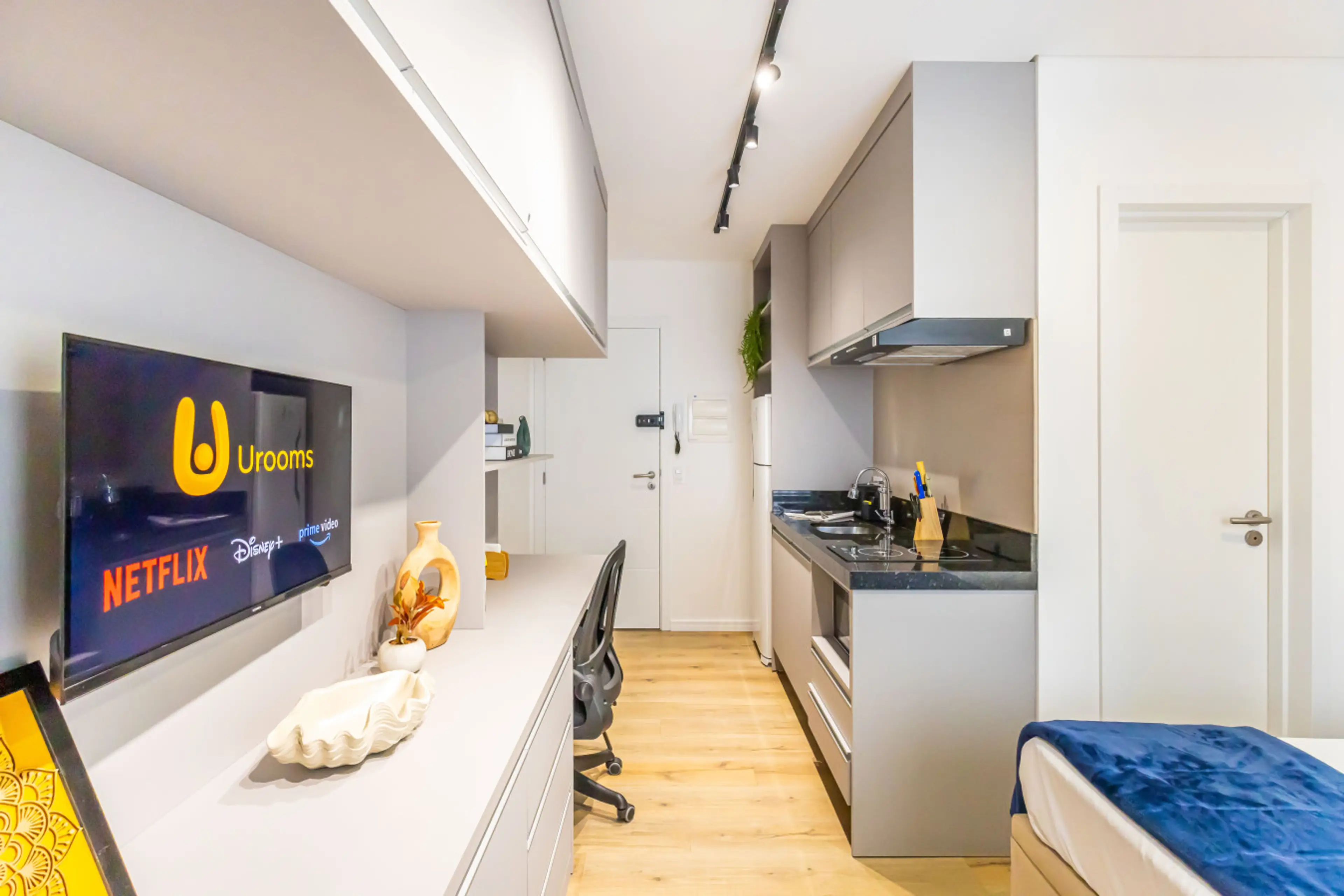 Studio totalmente pensado para Airbnb no Log Centro, região central de Curitiba, ao lado do passeio público e a 3 quadras do Shopping Mueller. Vaga de Garagem opcional, com contratação na segunda etapa da reserva pelo nosso site. Cozinha equipada com Geladeira, Fogão, Microondas , TV Smart, Cama Box...