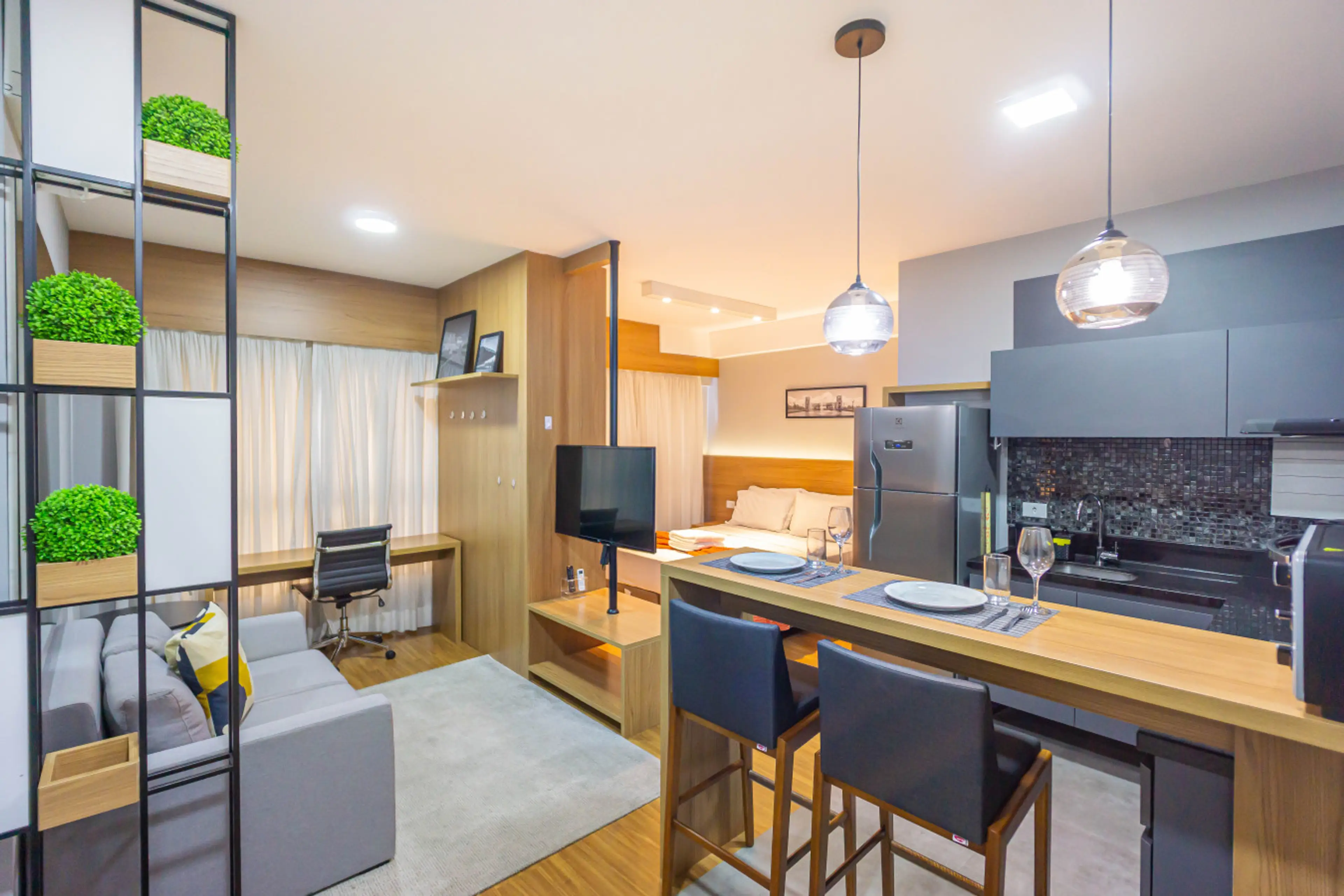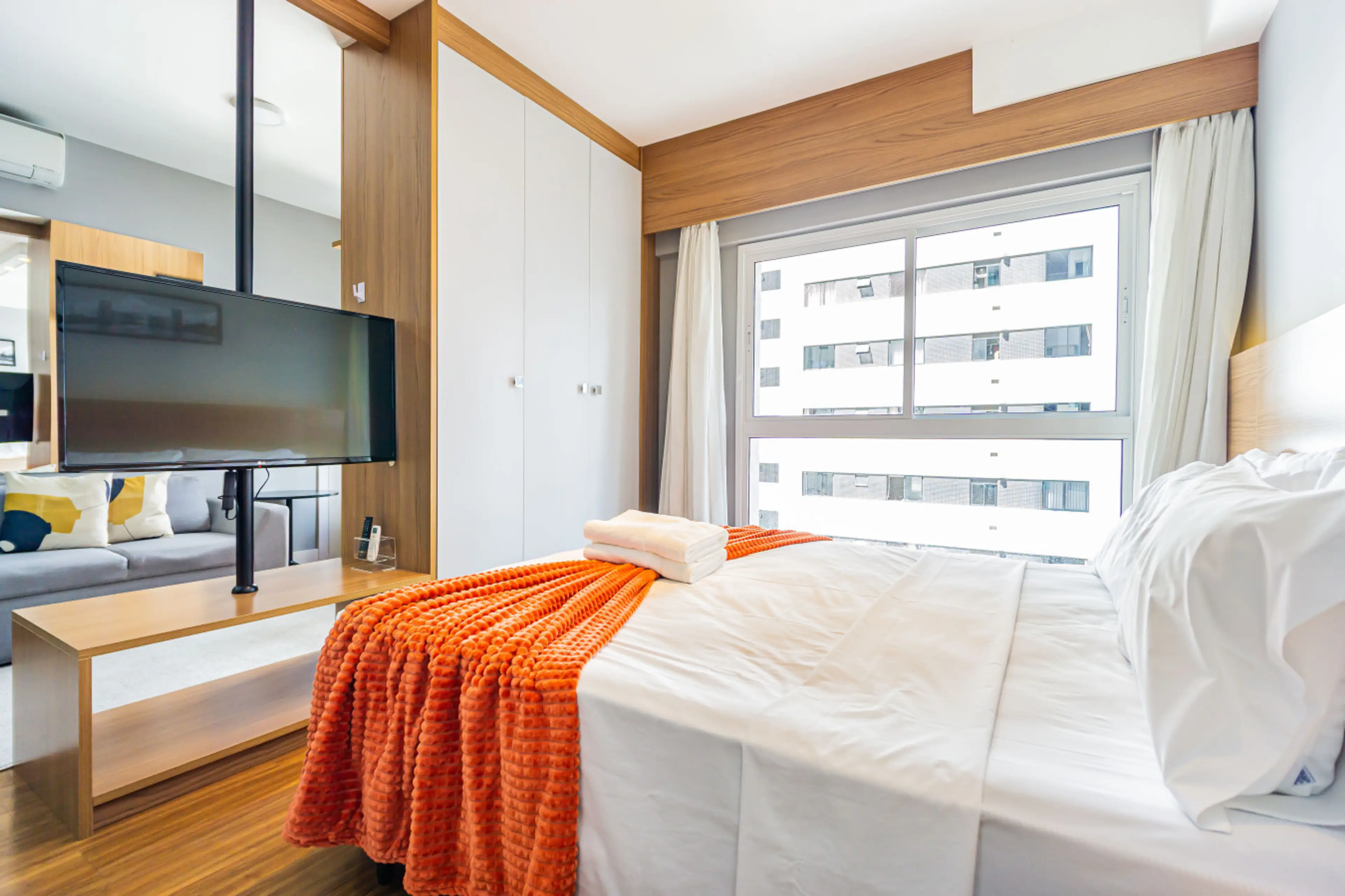 Studio Premium e aconchegante, totalmente pensado para Airbnb, em frente ao shopping curitiba, Cozinha completa equipada com Geladeira, Fogão, Microondas, TV Smart ", Cama Box Queen Premium padrão Hotel, wifi, bem espaçoso mesmo sendo estudio. Vaga de Garagem opcional, com contratação na segunda et...