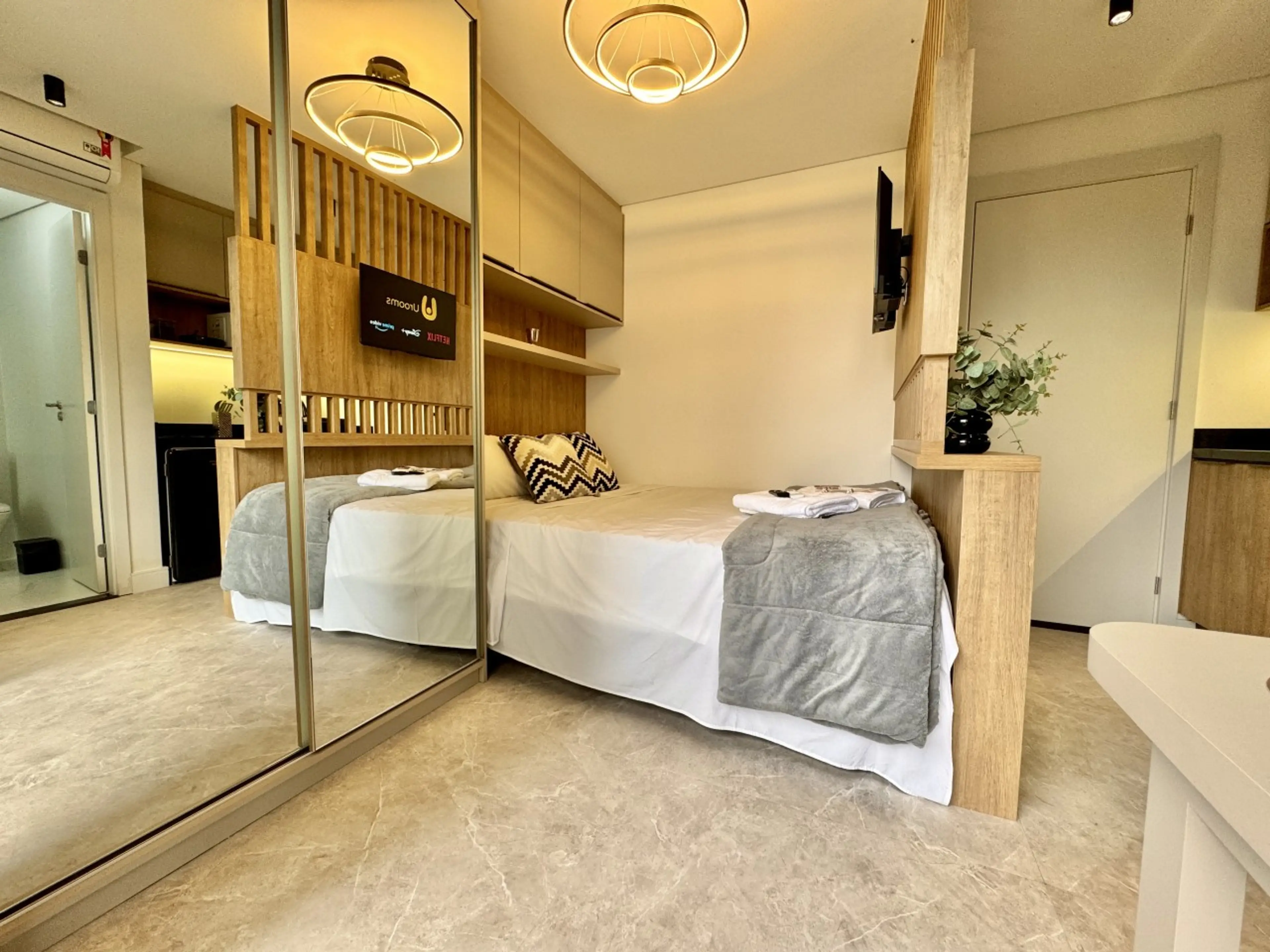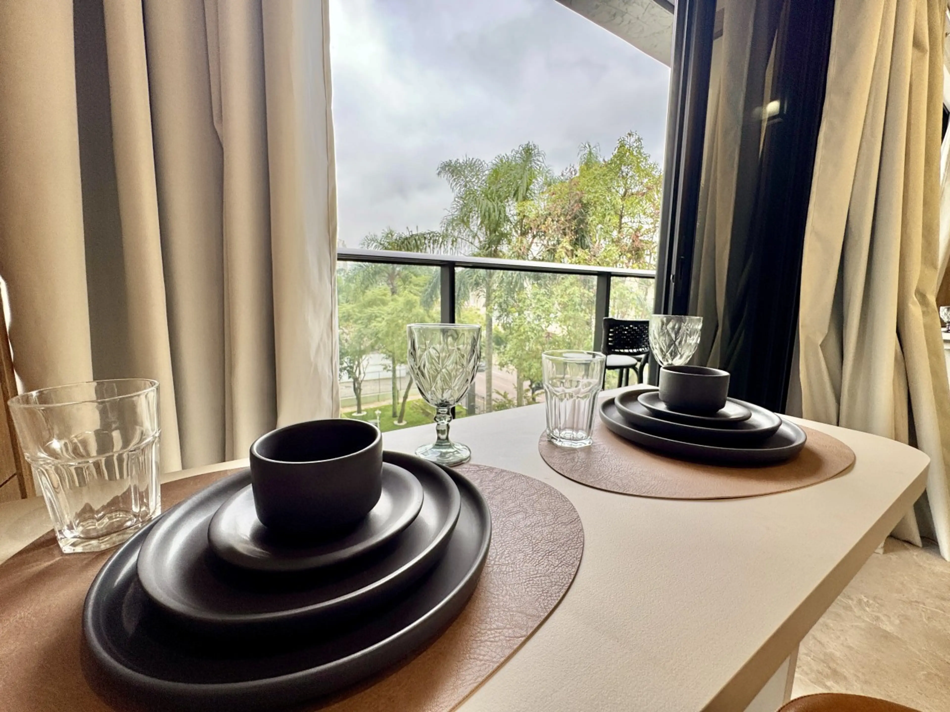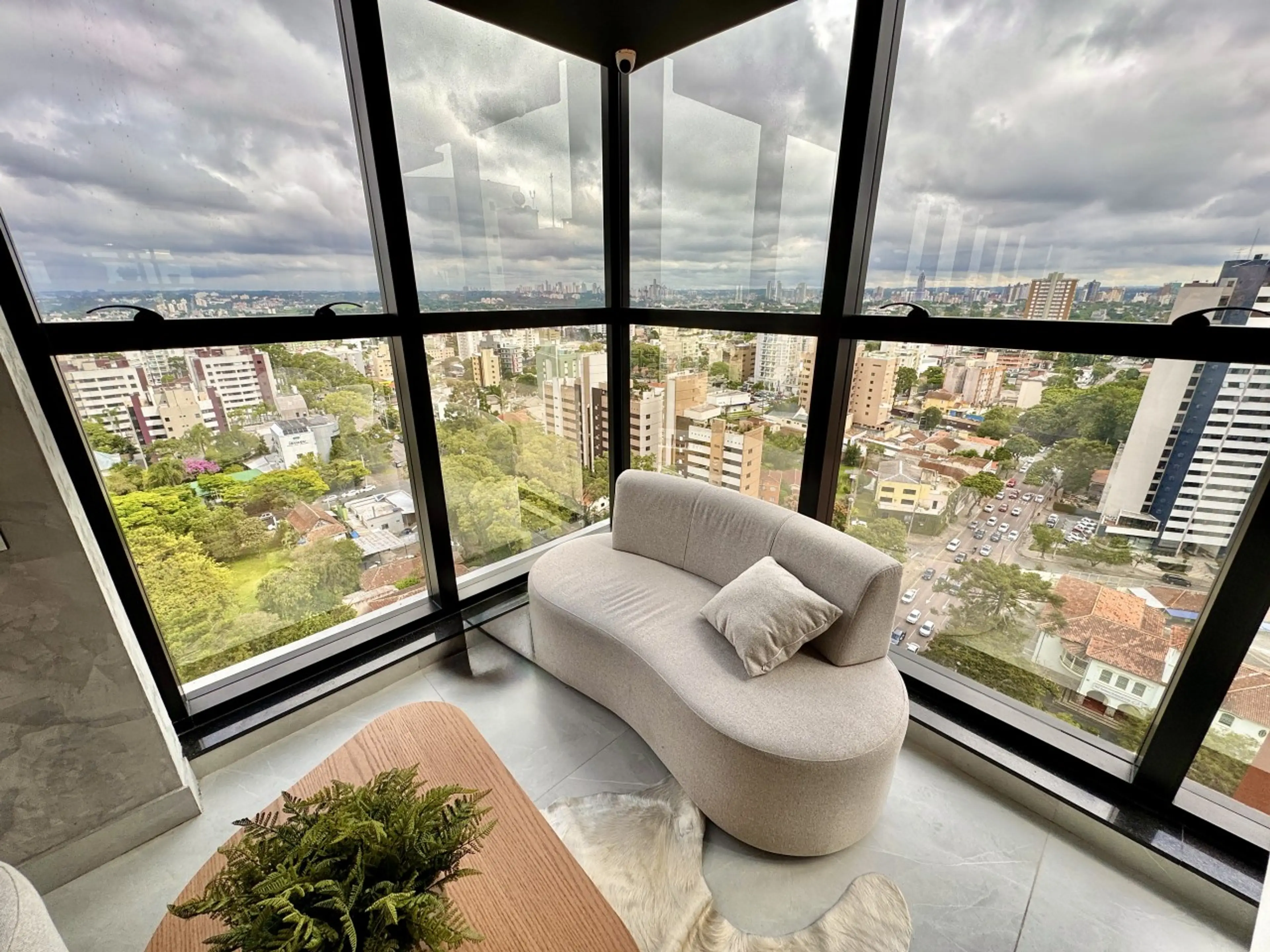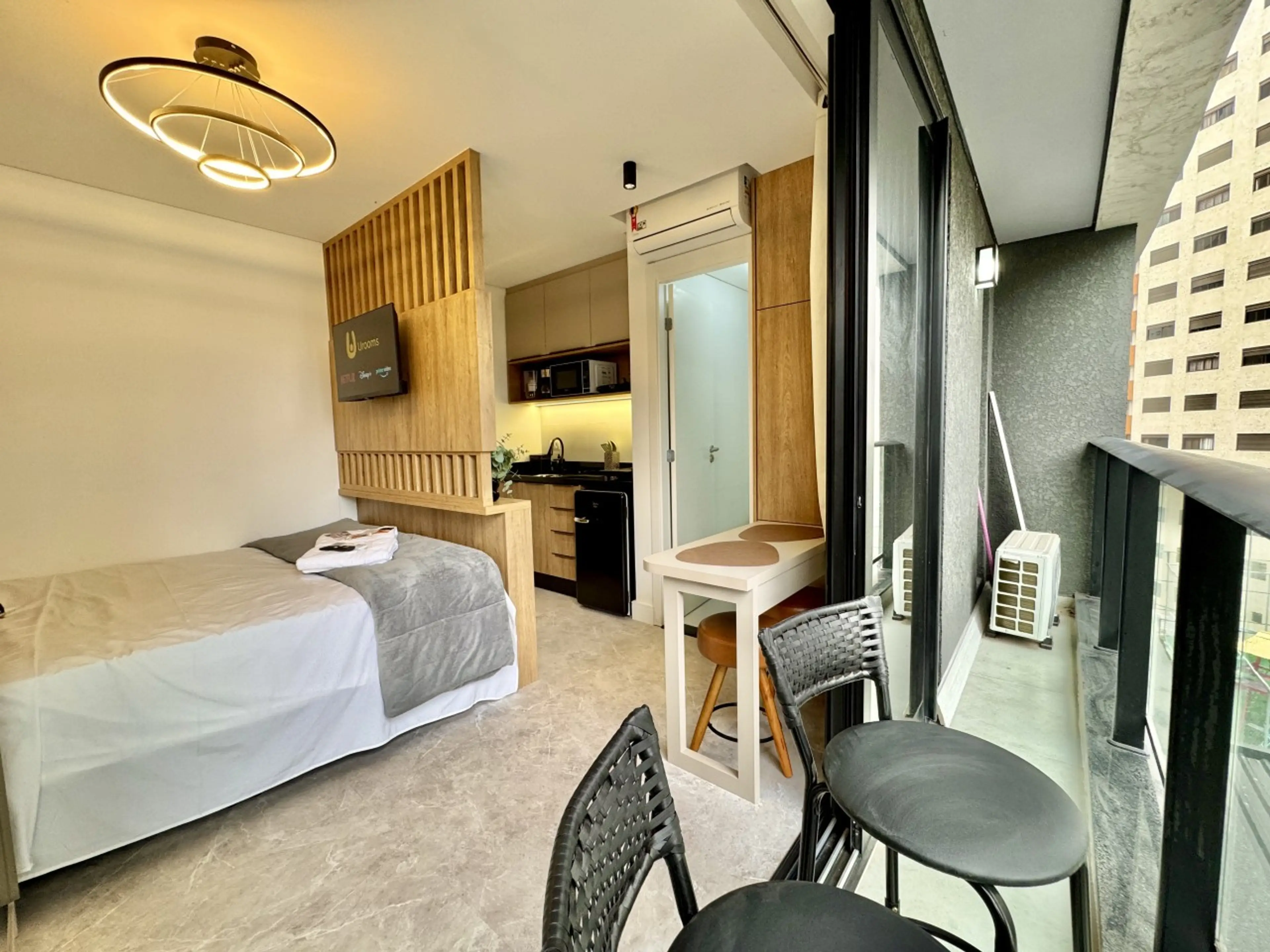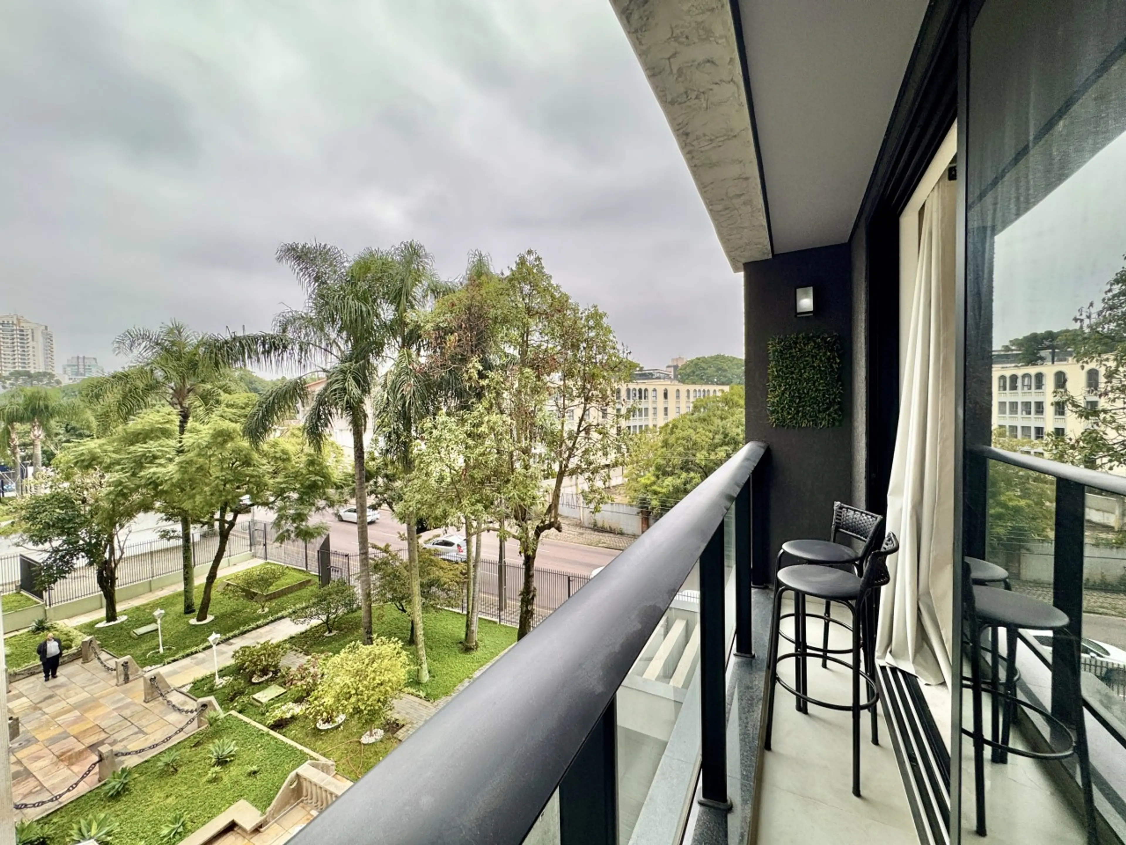 Studio completo com sacada no coração do Batel, Curitiba. ✅ Cama de casal com roupa de cama premium ✅ Sacada privativa com cadeiras e vista arborizada ✅ Cozinha equipada: placa de indução, micro-ondas, cafeteira ✅ Banheiro com bancada de mármore e chuveiro chuva ✅ Garagem disponível (cobrada à parte...